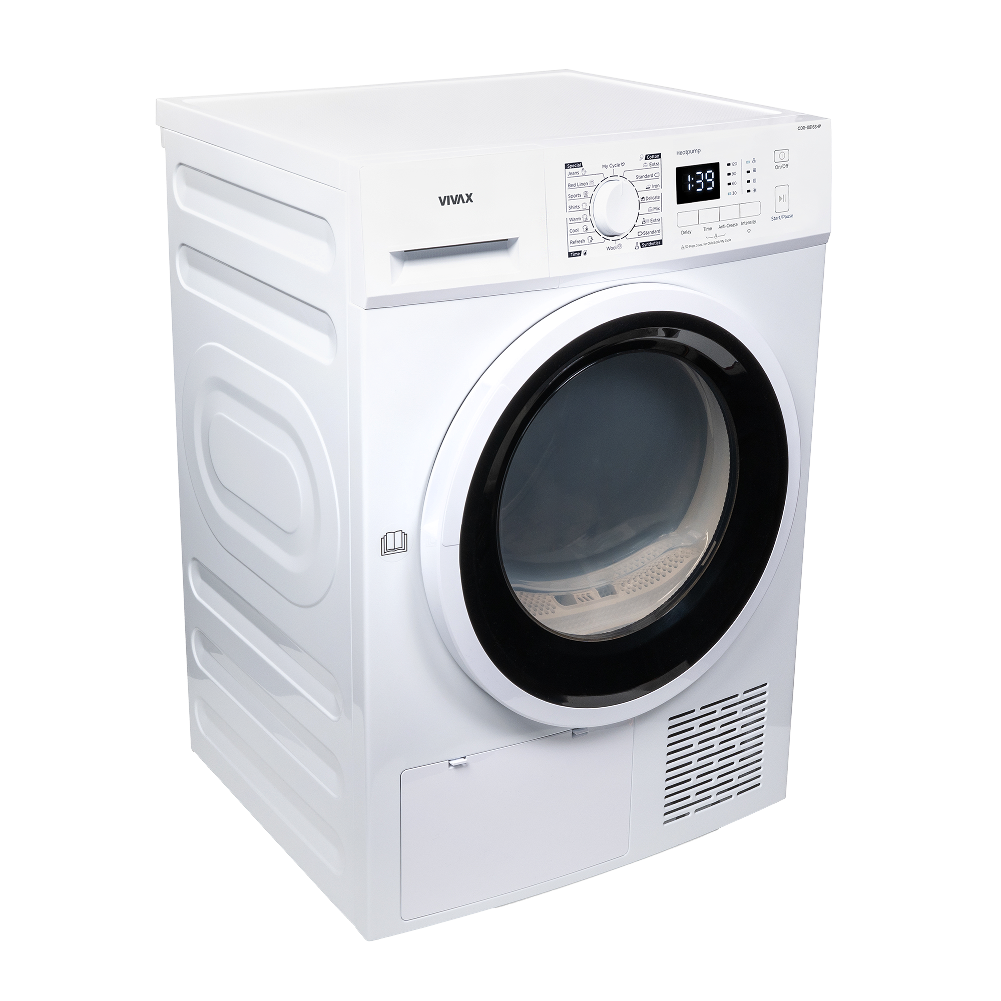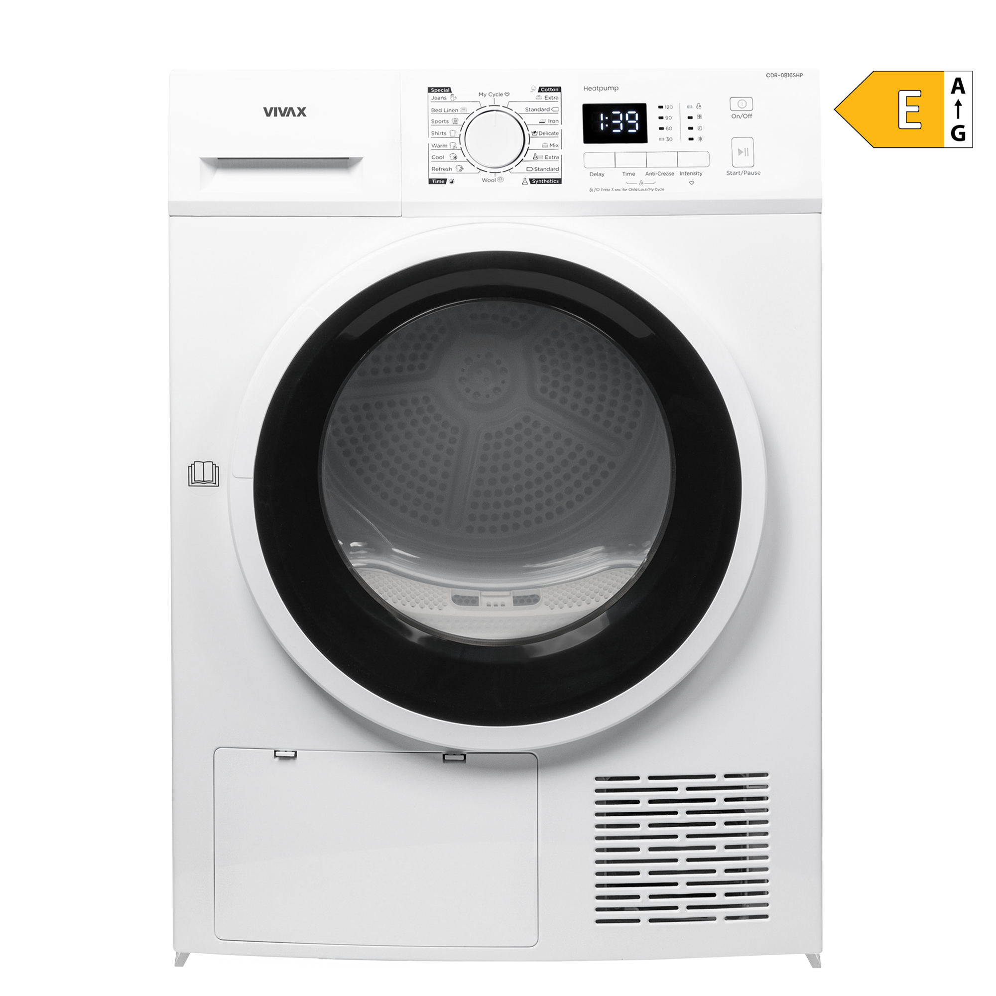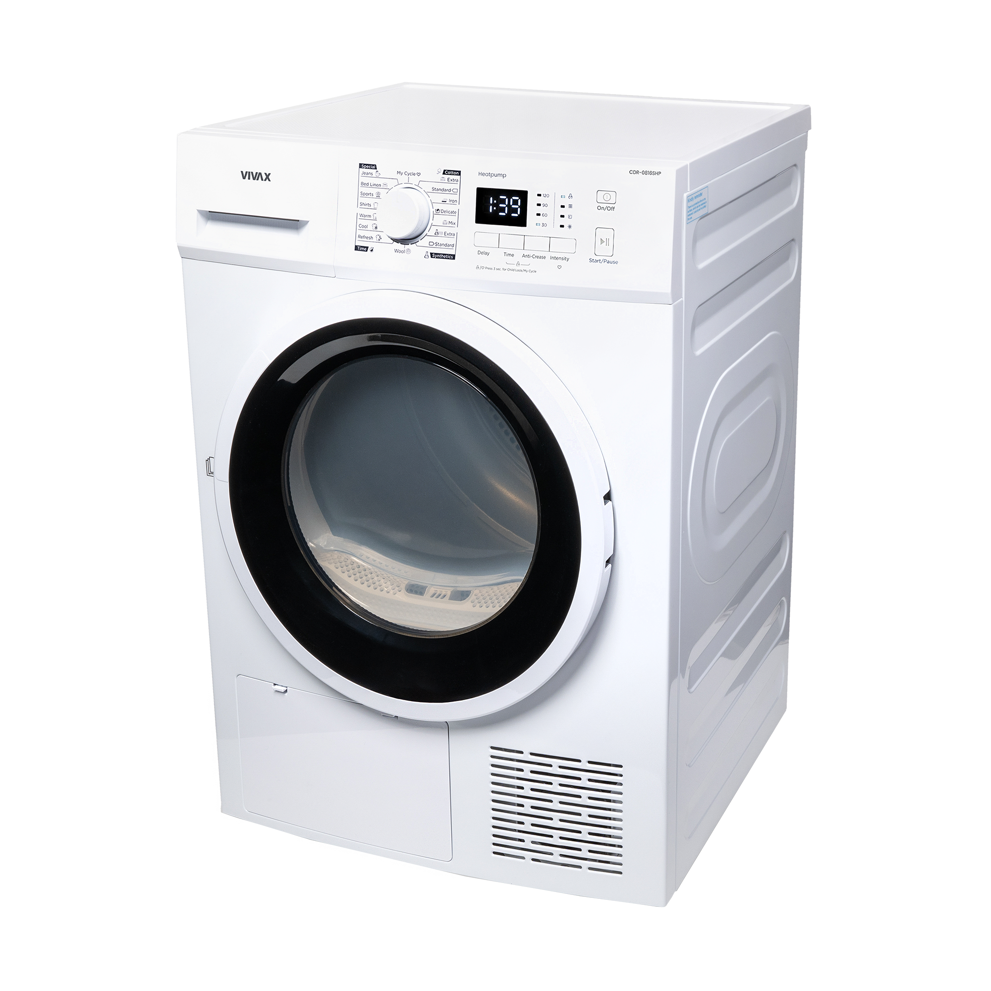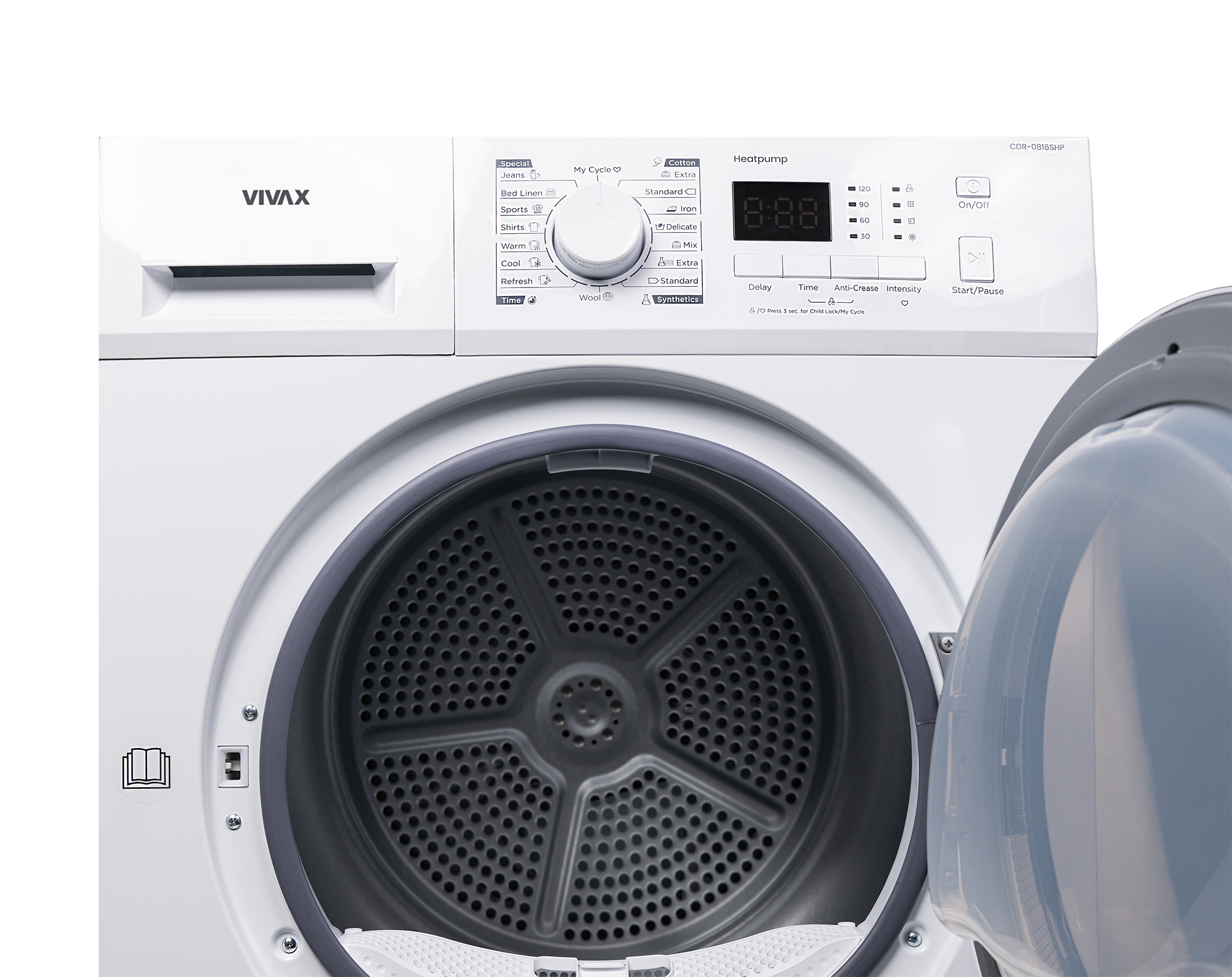 Das Bedienfeld des VIVAX Wäschetrockners CDR-0816SHP verfügt über einen zentral angeordneten Drehknopf zur Programmauswahl sowie einen Bildschirm und LED-Anzeigen mit allen notwendigen Signalen und Hinweisen, die für den Trocknungsvorgang wichtig sind – sie starten den Trocknungsvorgang mit nur wenigen Handgriffen . Das Gas in der Wärmepumpe ist R290, das eine hohe Trocknungseffizienz bei geringem Energieverbrauch ermöglicht und die Ozonschicht nicht schädigt.