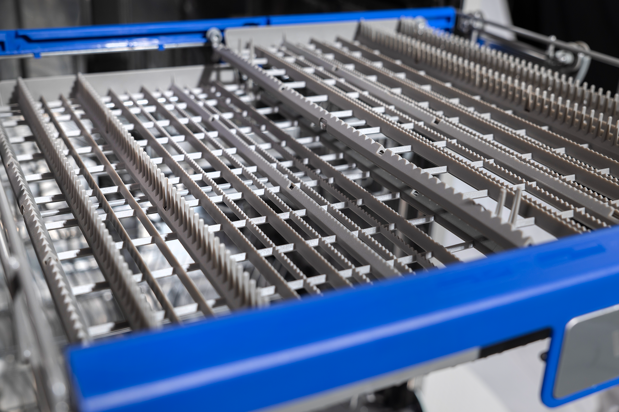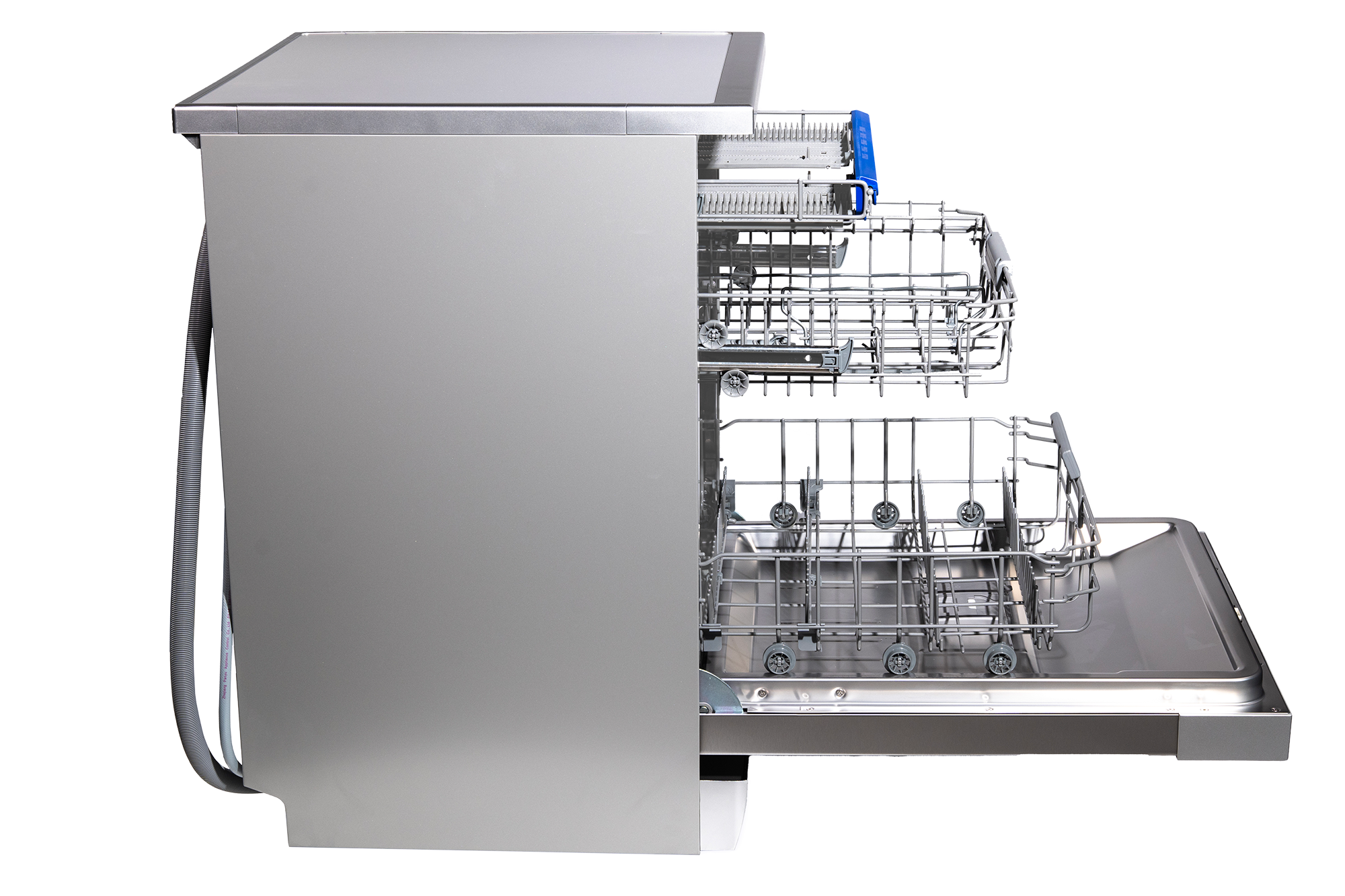 Dieser Geschirrspüler bietet Platz für 14 Gedecke in zwei großen Körben mit klappbaren Ablagen und einem zusätzlichen dritten flachen Korb für Besteck, der sich ganz oben im Spülbereich befindet.