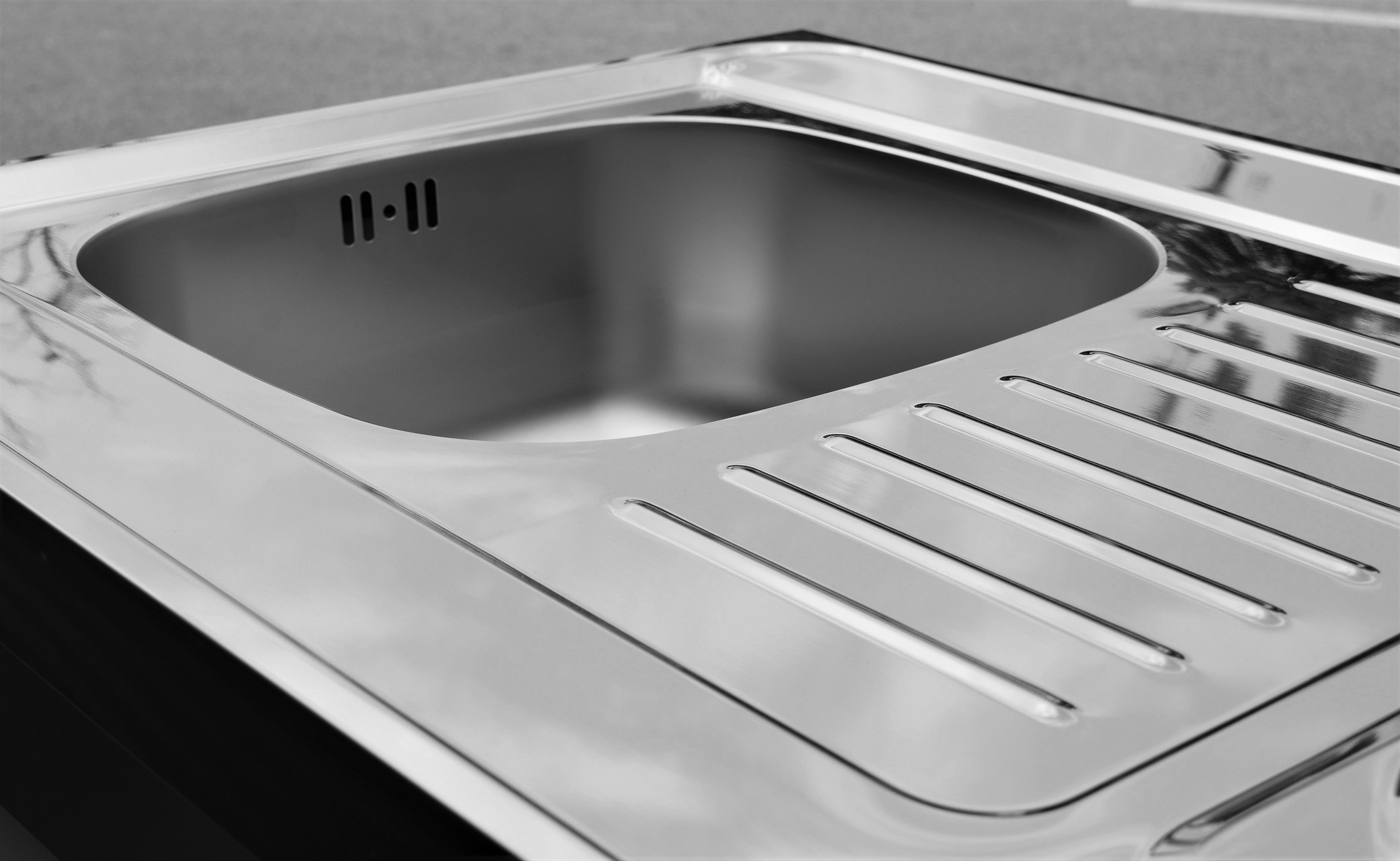 Das Waschbecken ist 34x17x37 cm groß und 17 cm tief. Neben der Spüle befinden sich ein Siphon (60 mm) und Abflussrohre. Die VIVAX Miniküche MK-0210XA SET verfügt über eine Spiegeldrehfunktion, um den Kühlschrank auf der linken oder rechten Seite zu platzieren.