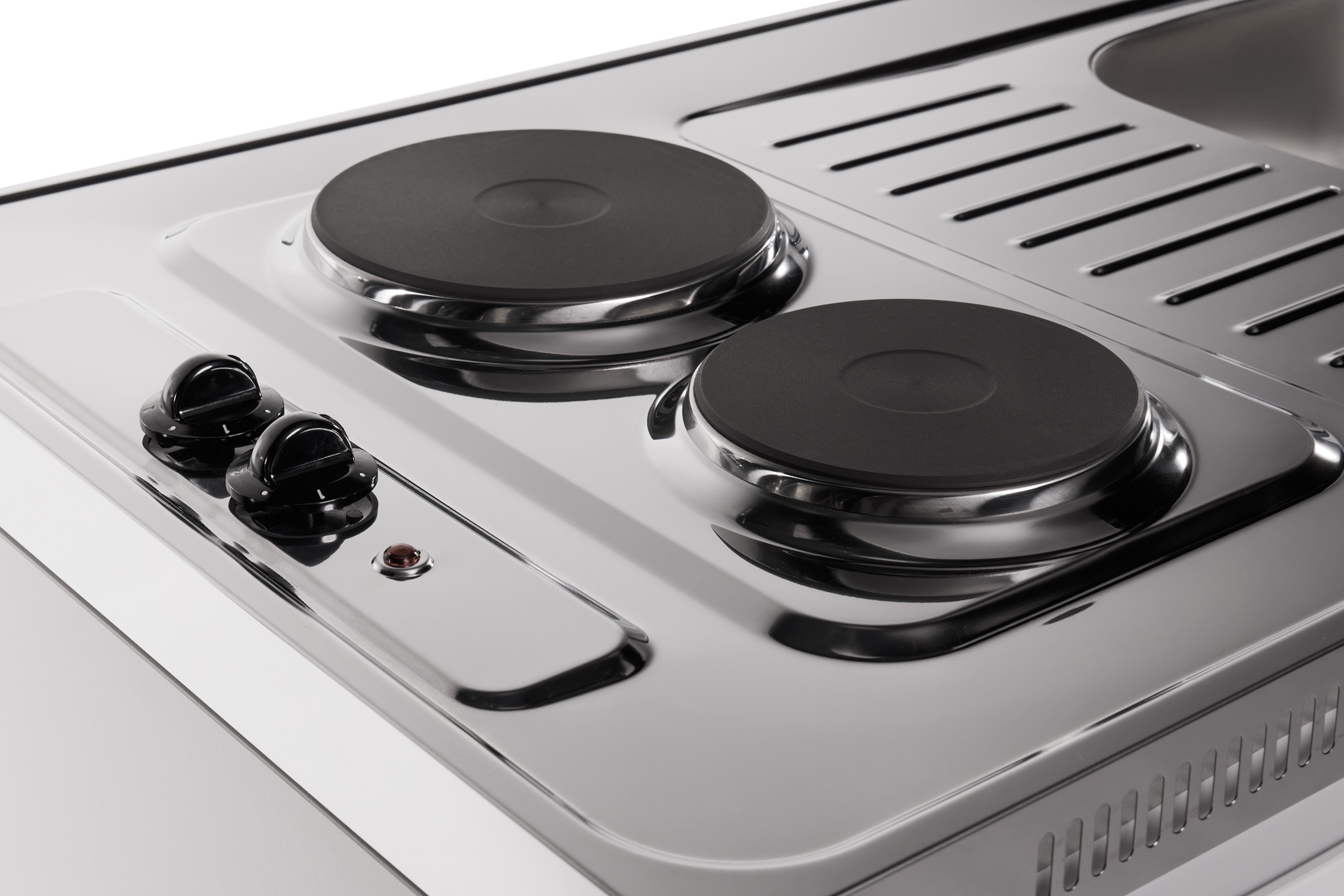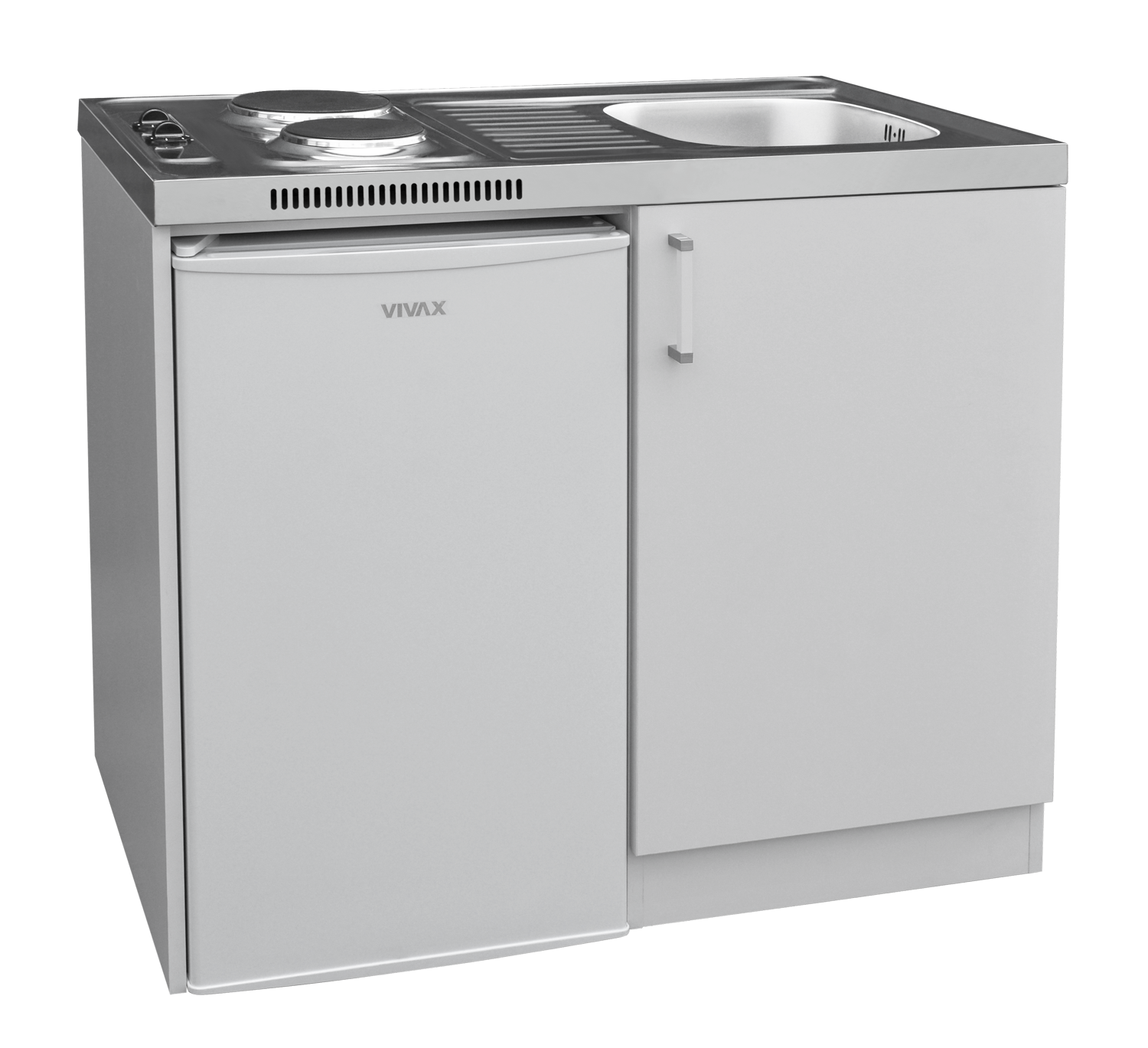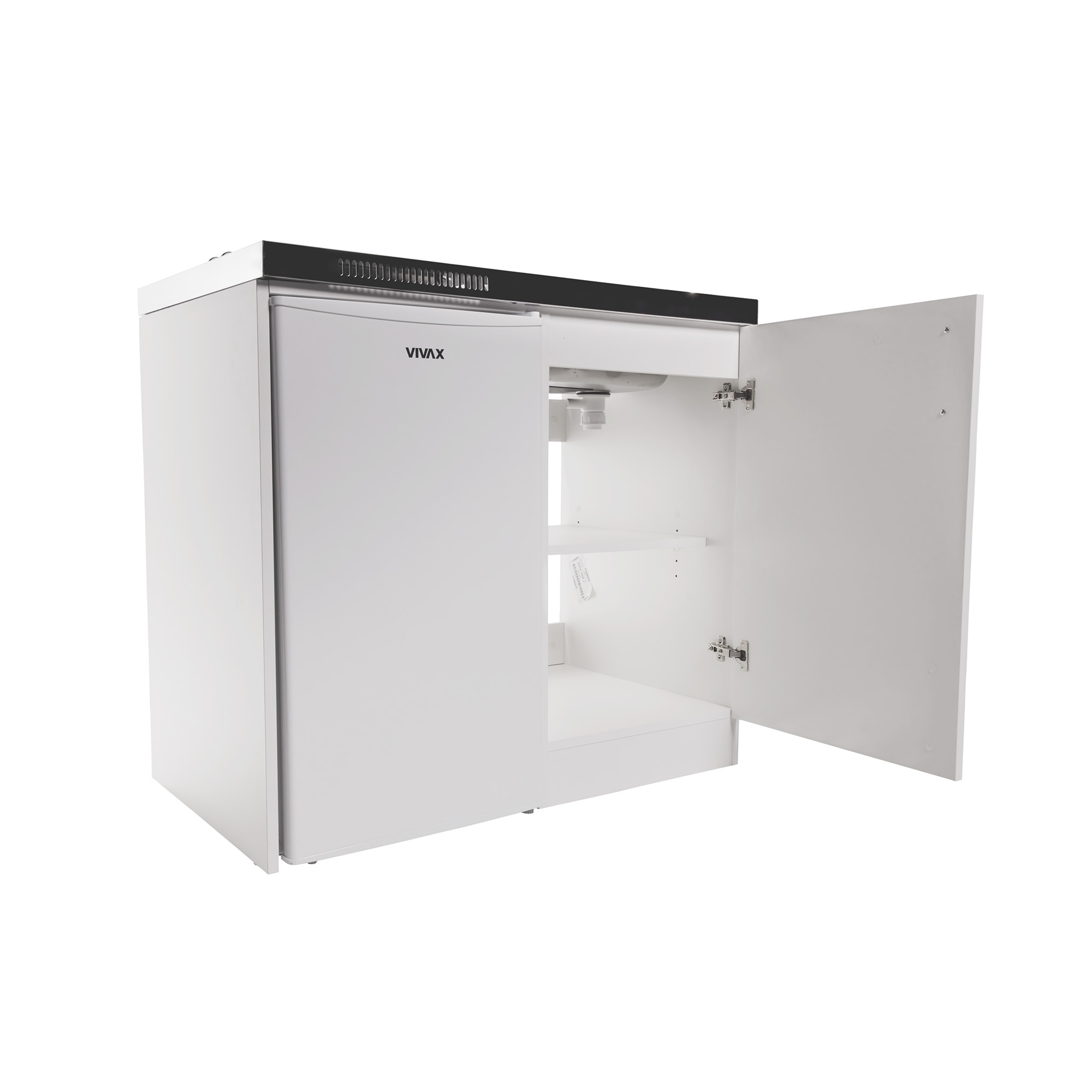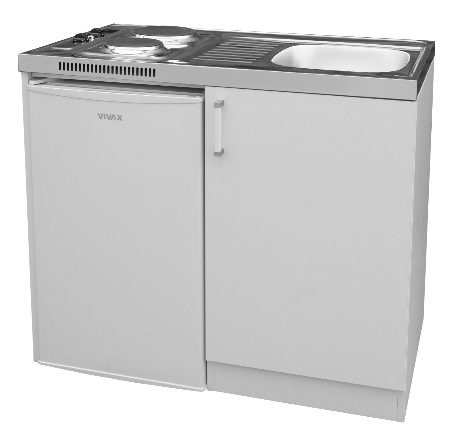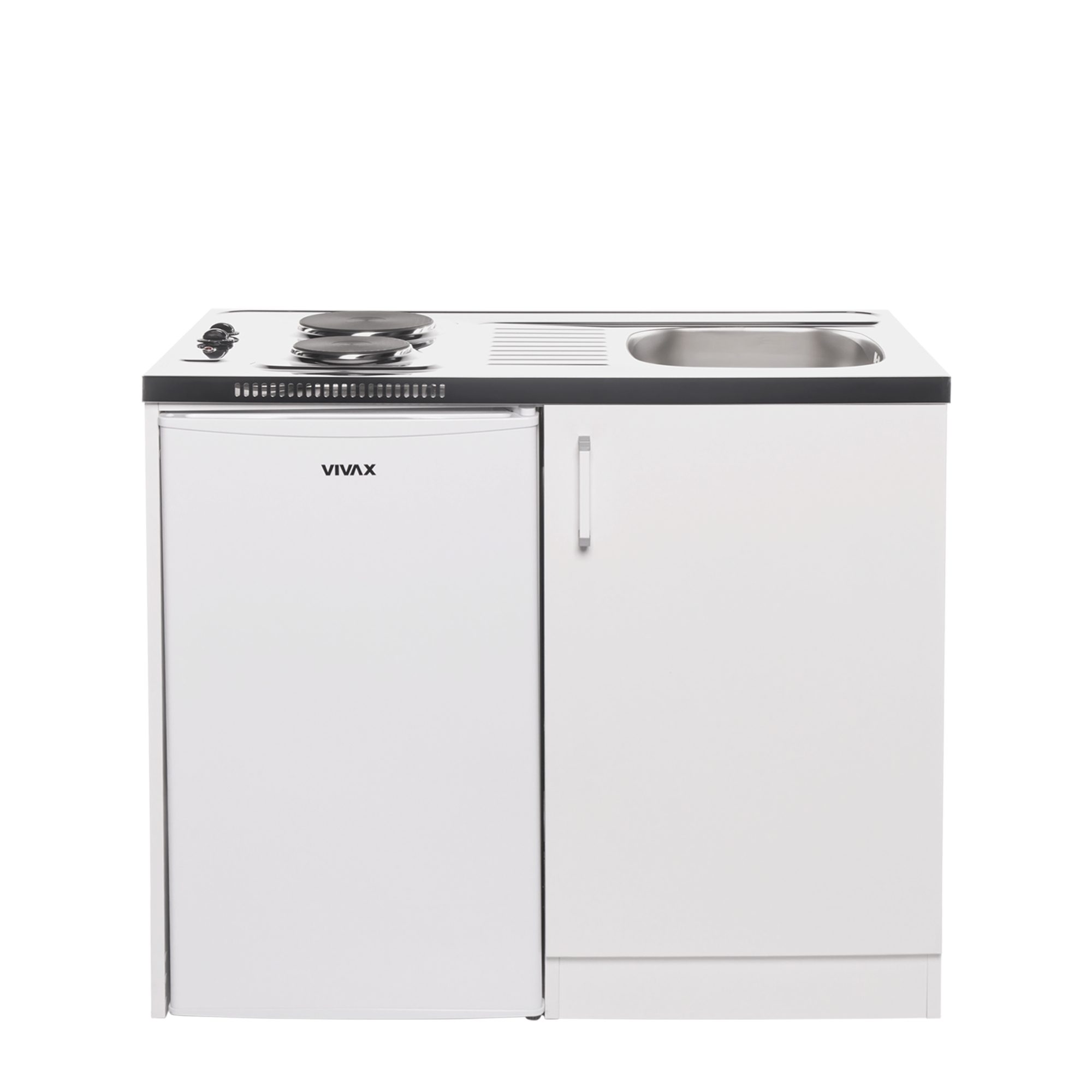 Es ist in Weiß erhältlich. Das Mini-Küchenset enthält einen Kühlschrank VIVAX TTR-93, ein Edelstahlkochfeld MK-0210XA mit integrierten Heizplatten und Spüle sowie einen Schrank aus hochwertiger Spanplatte mit den Maßen 100x85x60 cm.